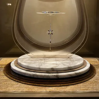 Conçu comme un véritable écrin, ce support réalisé en marbre blanc de Carrare met en valeur les créations de la maison grâce à un design élégant et à des finitions soignées.