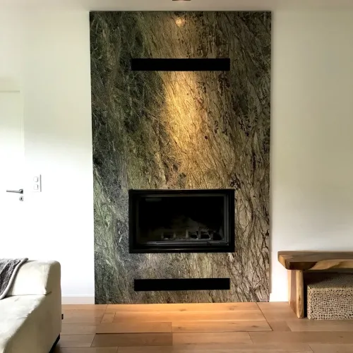 Nous avons réalisé l’habillage d’une cheminée en marbre Forest Green.